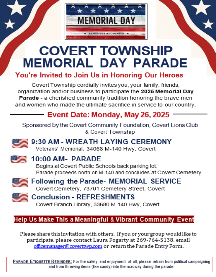 Covert Township cordially invites you, your family, friends, organization and/or business to participate in the 2025 Memorial Day Parade – a cherished community tradition honoring the brave men and women who made the ultimate sacrifice in service to our country.